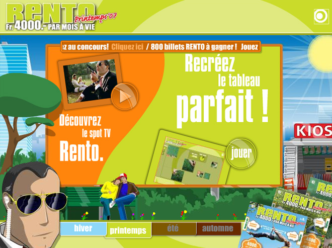 Qui dit nouvelles rentes, dit nouveau jeu en ligne (voir la démo). Selon la stratégie précédemment établie, chaque saison voit éclore sa propre animation sur Internet. Pour son premier printemps, le microsite du billet à gratter Rento se met au vert. Après la traque au garde du corps l’hiver dernier, les aspirants rentiers ont 45 secondes pour recréer le tableau parfait… |